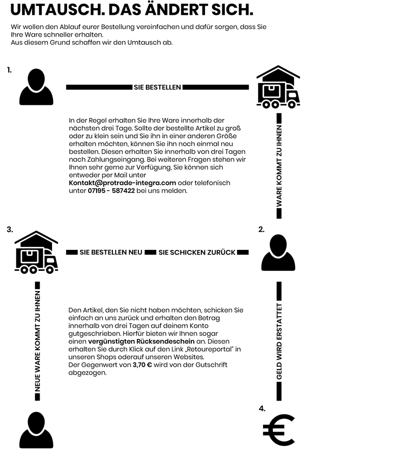 Bei Retouren aus dem Ausland oder allgemeinen Fragen zu deiner Rücksendung, wende dich bitte an kontakt@protrade-integra.com zwecks der weiteren Vorgehensweise bzw. Abwicklung.